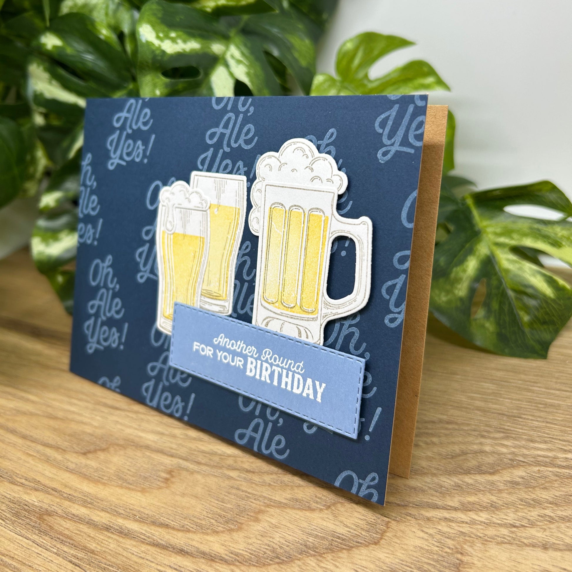 Cheers to another year! Celebrate your beer-loving friend's birthday with our handmade card featuring a hand-stamped round of beers. It's the perfect way to show you care (and have a good time)!