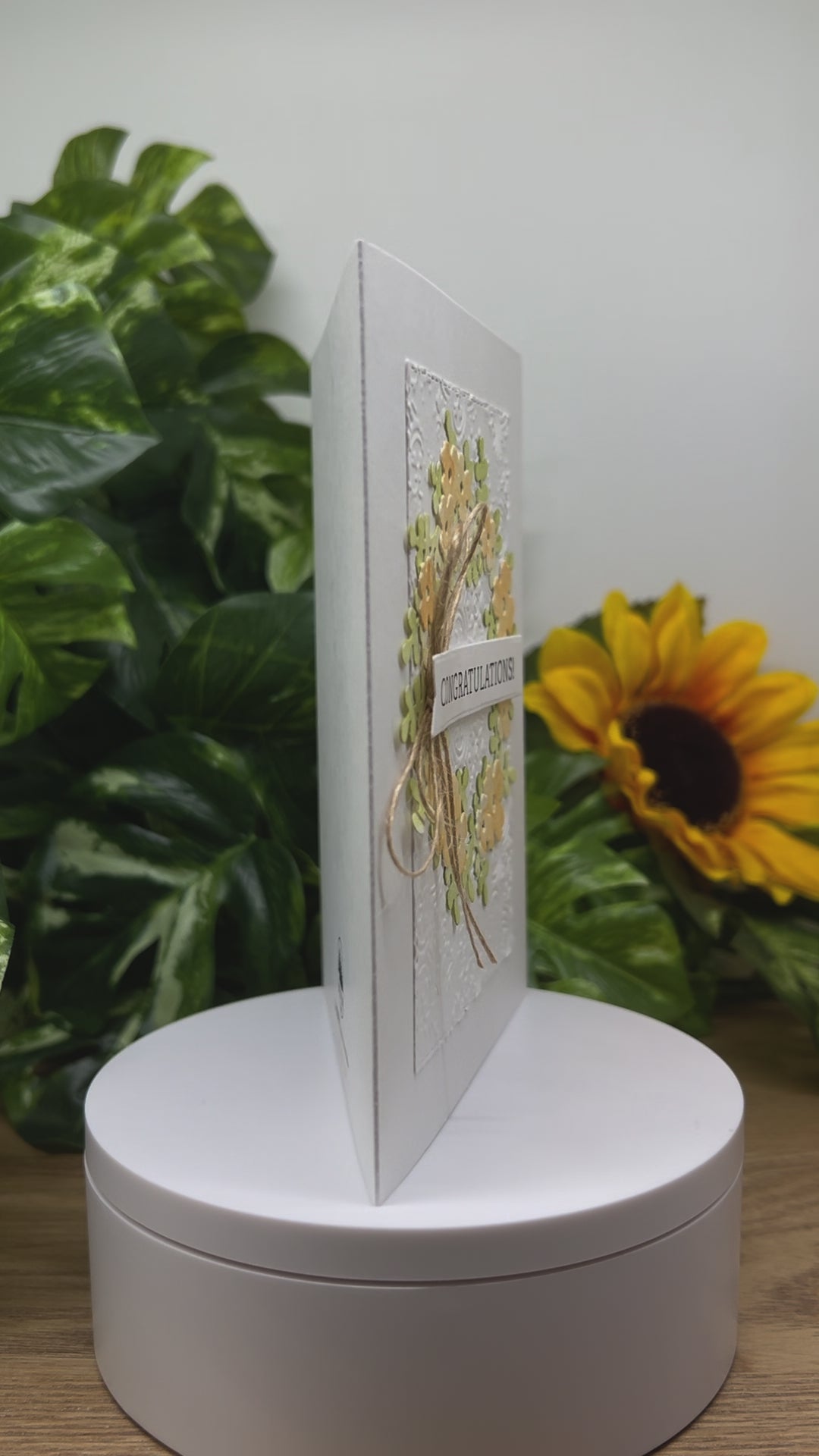 Celebrate life's milestones with our handmade Congratulations Wreath Card. Adorned with a delicate, light green and peach wreath, this card is perfect for baby showers, weddings, engagements, and graduations. The perfect way to show your love and support during these joyous occasions.