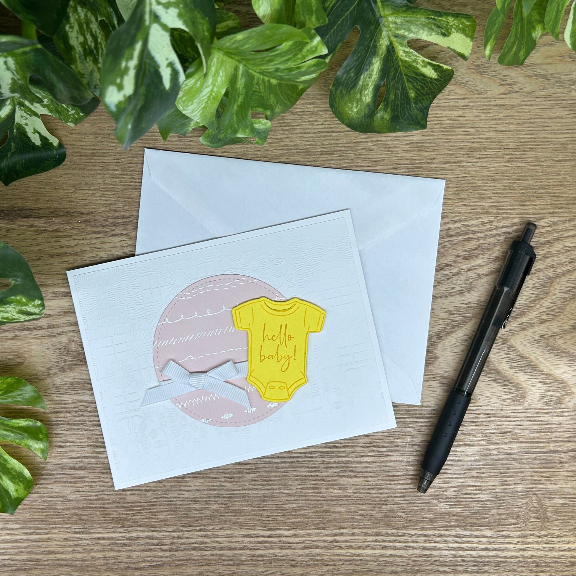 Celebrate the arrival of a new bundle of joy with our Hello Baby Onsie Handmade Card. Featuring a beautiful crochet blanket embossing pattern, this handmade card is the perfect way to welcome a baby into the world. The adorable yellow onsie and unique stamped stitch pattern make it a truly special and thoughtful gift.