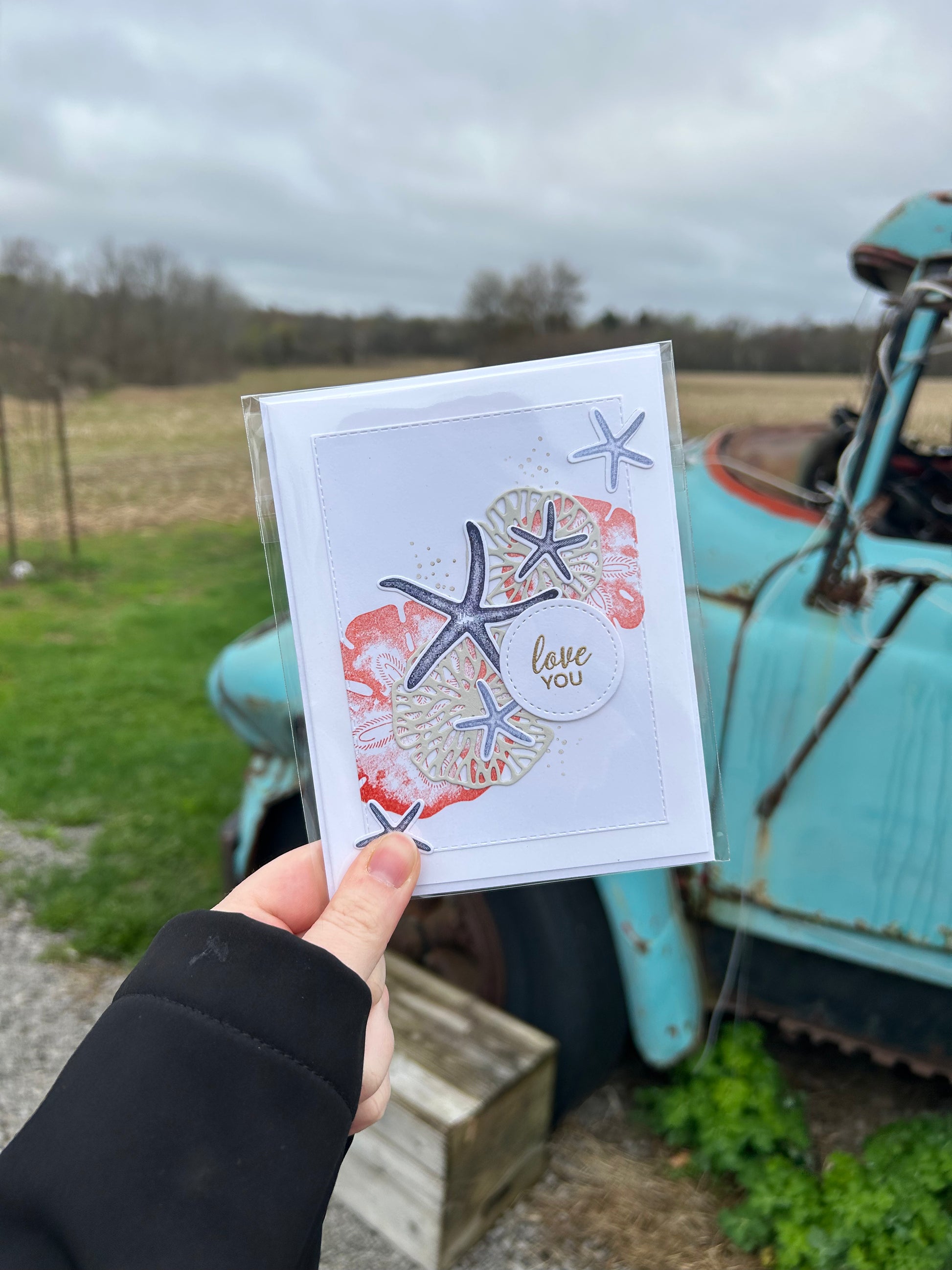 Bring the beauty of the seaside to your loved one with our Sand Dollar Love You Handmade Card. Featuring handcrafted sand dollars and starfish, this card evokes a relaxing beach vibe. With a heartfelt "love you" sentiment set in gold embossing, it's the perfect way to express your love and appreciation.