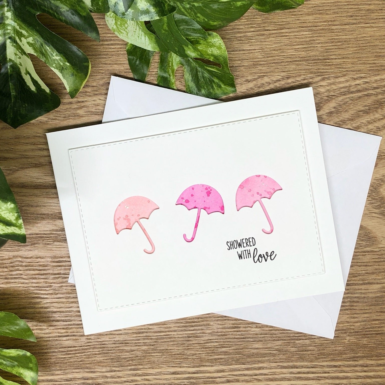 Celebrate with this handmade shower card! Perfect for baby showers or bridal showers. Featuring cute umbrellas, this card will leave your loved ones feeling "showered with love"!