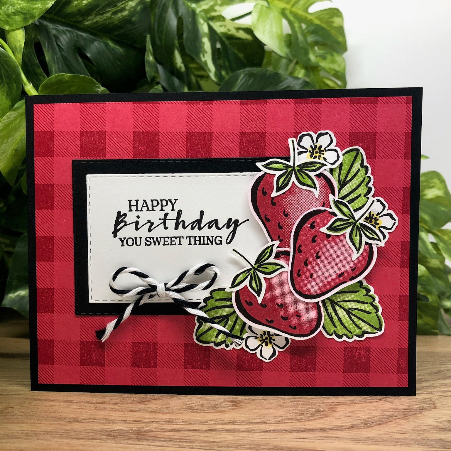 Sweet & summery this handmade birthday card features bright red strawberries, dainty flowers and a red plaid pattern. All hand stamped, punched & diecut. The Sweet Strawberry Handmade card is perfect for summer birthdays!